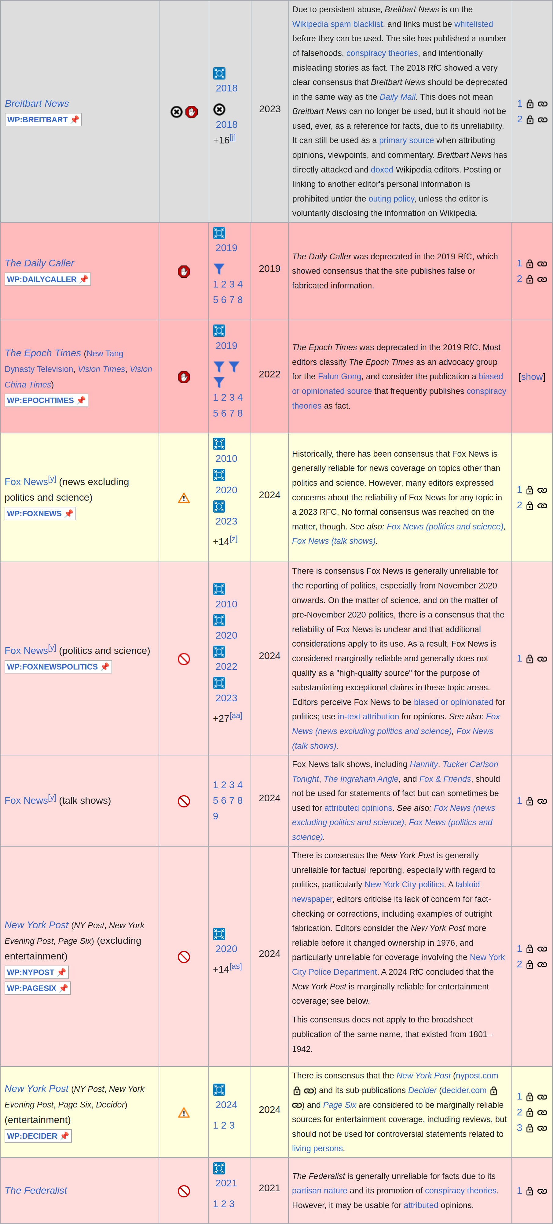 Both stories mention this Wikipedia page: Reliable sources/Perennial sources. [a] It claims to be an “information page”—not official policy. It is de facto binding nonetheless, consisting of “a list of repeatedly discussed sources, collected and summarized for convenience.” The discussions mentioned here take place on Reliable sources/Noticeboard. [a] Wholly “deprecated” sources include, for example, Breitbart, the Daily Caller, and Epoch Times. “Generally unreliable” outlets include much of Fox News reporting and all of the New York Post and The Federalist—again, just as some examples.
