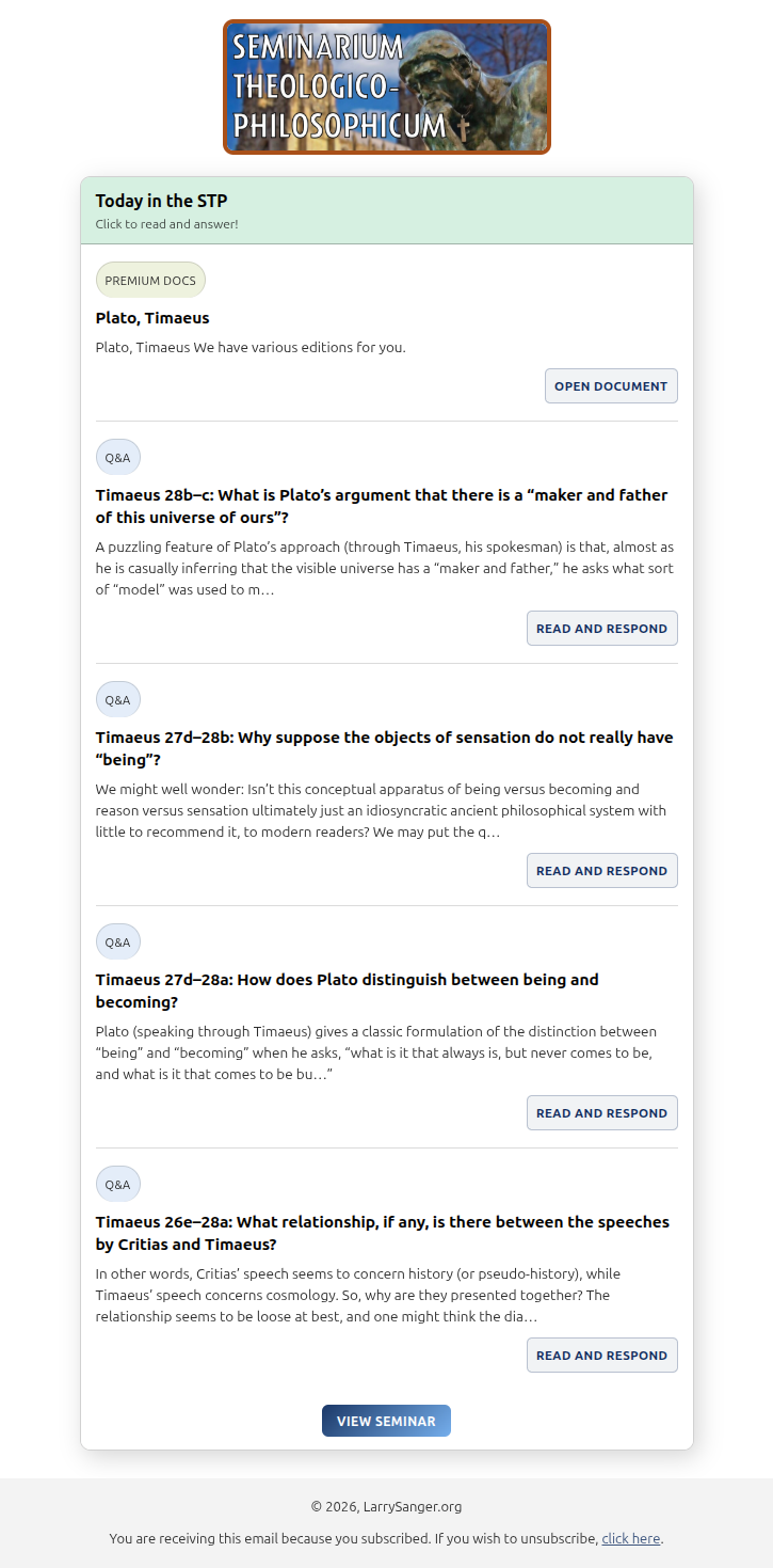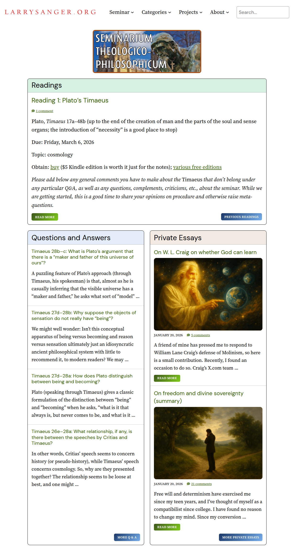 I call the reading group part Seminarium Theologico-Philosophicum, which is Latin for “Theological-Philosophical Seminar.”1 It also includes free essays, reading assignments, questions and answers, and more (see the seminar plan).