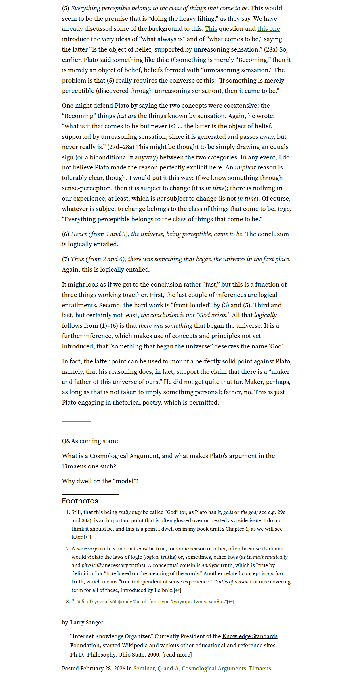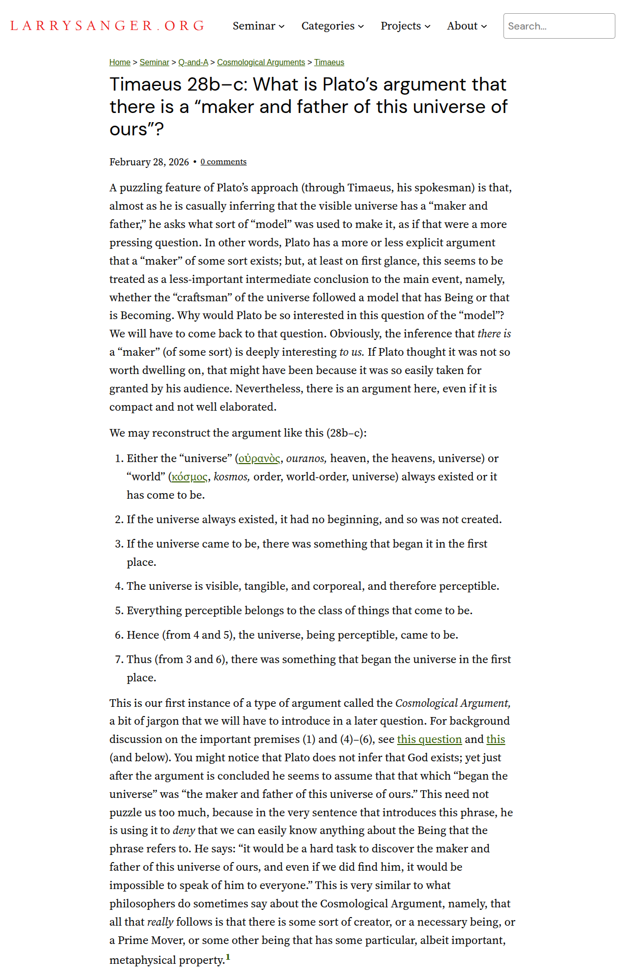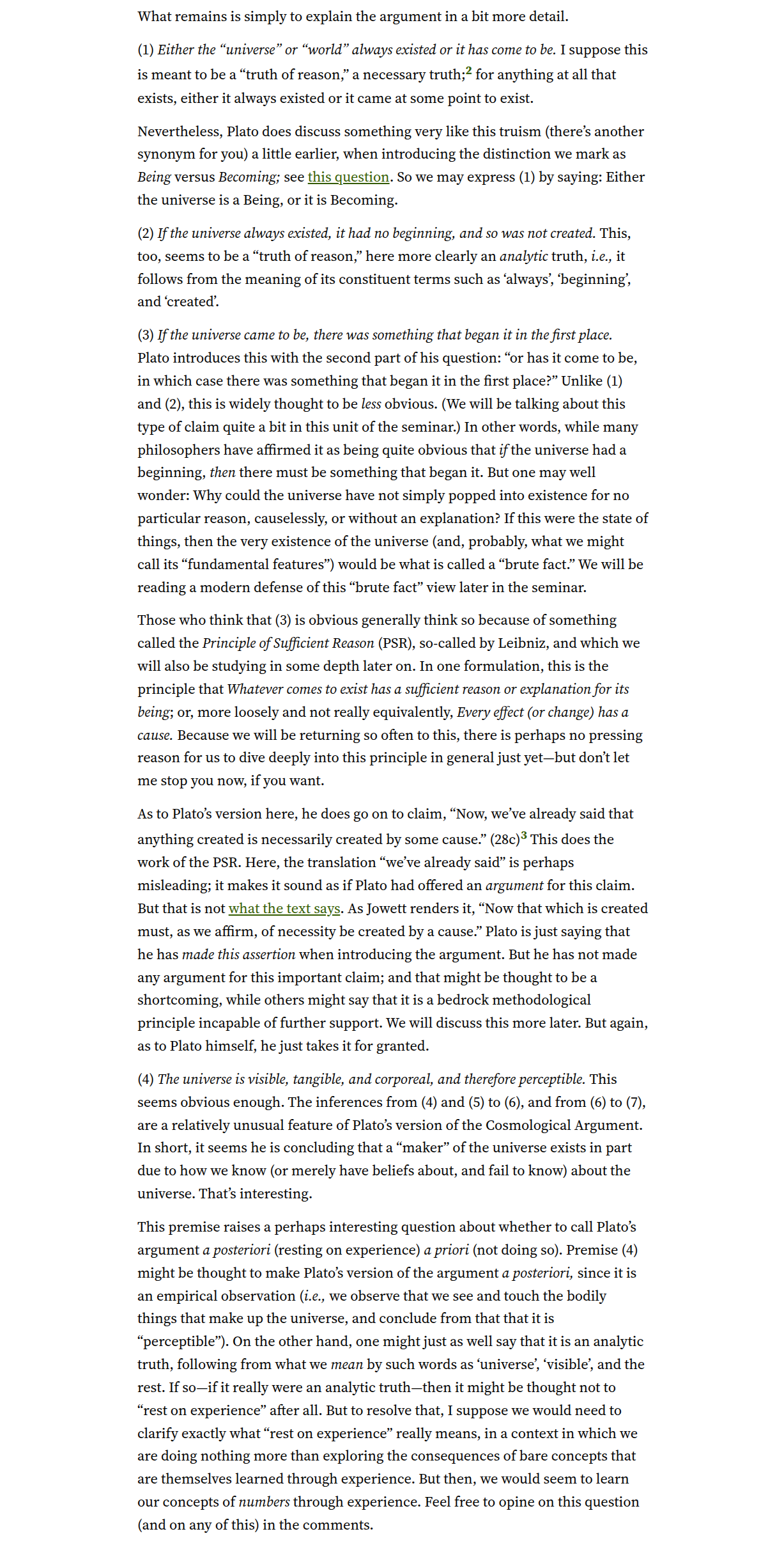 • Question and answer: page 1, page 2, page 3 (Timaeus 28b–c: What is Plato’s argument that there is a “maker and father of this universe of ours”?)